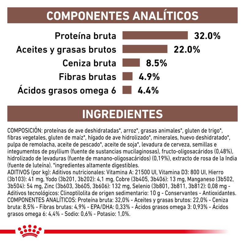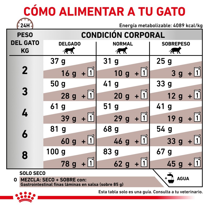 Como parte de la gama ROYAL CANIN® VeterinaryHealth Nutrition, solo debes dar este producto a tu mascota si te lo recomienda un veterinario . La transición de tu mascota de una dieta a otra debe realizarse de forma lenta y gradual durante un período de 7 a 10 días. Debes asegurarte de ofrecer las raciones correctas, particularmente si la alimentación es mixta.