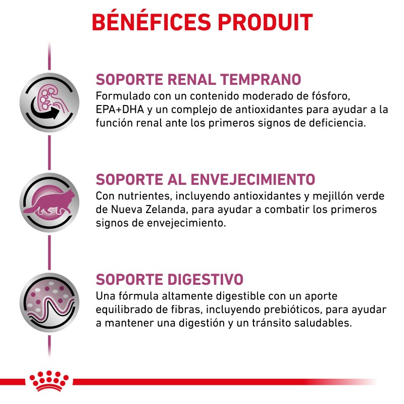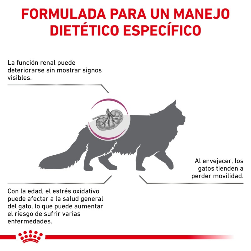 Esta dieta está formulada con antioxidantes, EPA y DHA y con un contenido moderado de fósforo para ayudar a mantener la función renal de tu gato ante los primeros signos de deterioro.