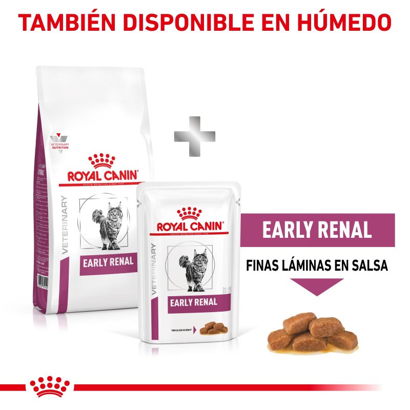 Para satisfacer las preferencias individuales de cada gato, ROYAL CANIN® Early Renal también está disponible como alimento húmedo en forma de finas láminas en salsa.