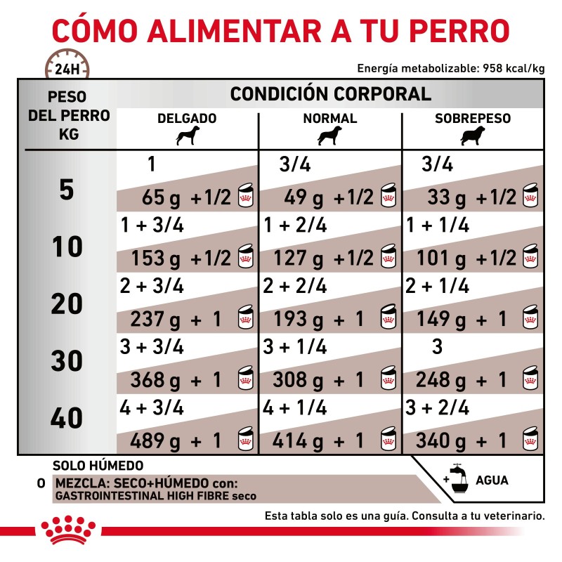 Como parte de la gama ROYAL CANIN® VeterinaryHealth Nutrition, solo debes dar este producto a tu mascota si un veterinario te lo recomienda. La transición de tu mascota de un alimento a otro debe realizarse de forma lenta y gradual durante un período de 7 a 10 días. Debes asegurarte de ofrecer las raciones correctas, en especial si la alimentación es mixta.
